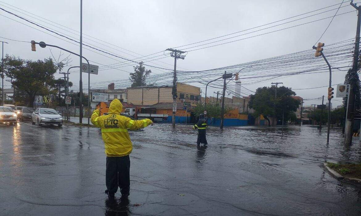 Em razão dos fortes temporais, o Lago Guaíba, em Porto Alegre, subiu mais de 3 metros e transbordou, alagando ruas e avenidas. A prefeitura precisou fechar comportas e reforçar a contenção das águas com sacos de areia.