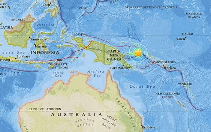 Mapa mostra local do epicentro do terremoto, perto da costa de Papua Nova-Guiné (USGS/Reprodução)