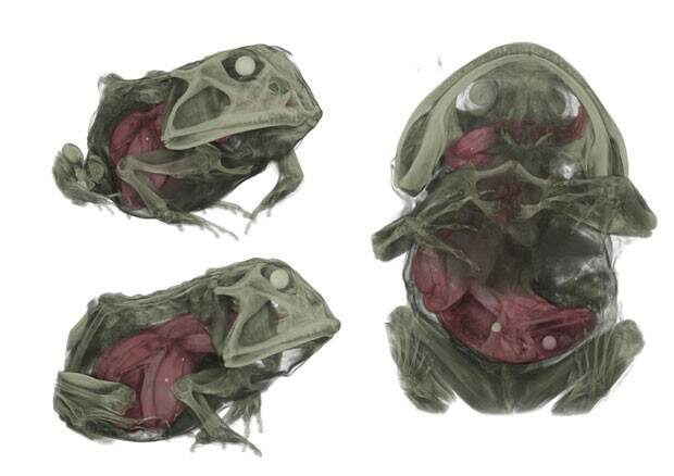 Elas parecem ser as imagens de uma maleta em formato de sapo passando pelo raio-X da segurança de um aeroporto. Mas esses modelos em 3D revelam os detalhes de uma vida e uma morte extraordinárias. Indicado pela cor vermelha está um sapo inteiro, completamente enrolado dentro do estômago de seu predador – outro sapo.