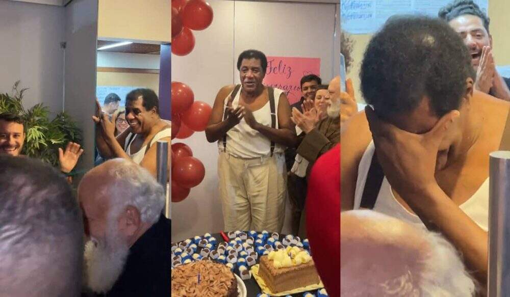 Tony Tornado fez aniversário nesta sexta-feira (26), e ganhou uma festa surpresa de seus colegas de elenco da novela “Amor Perfeito”, da Rede Globo, a qual esta trabalhando atualmente no papel de frei Tomé. O ator, que completou 93 anos, ficou bastante emocionado com a homenagem no set de filmagens, e o vídeo do momento repercutiu nas redes sociais neste sábado (27).