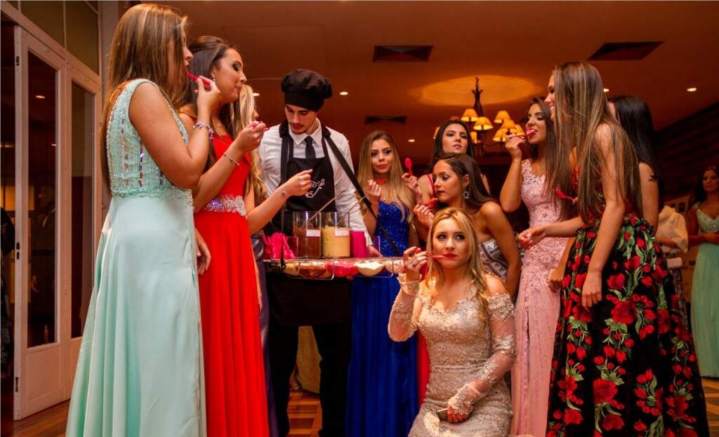Doce momento: as candidatas a Glamour Girl 2016 experimentaram os brigadeiros gourmet que João Vitor Braga carregava. (Foto: Pedro Antonio Heinrich/especial)