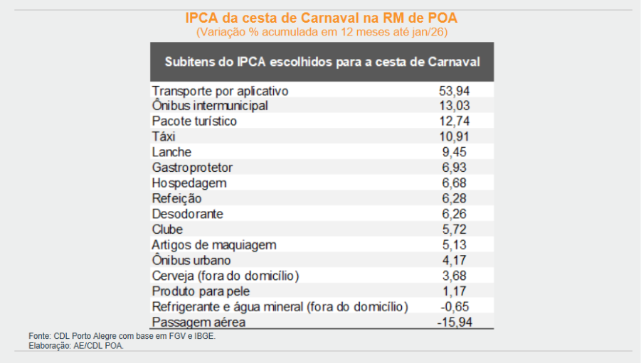 Foto: Tomaz Silva/Agência BrasilA chamada inflação do carnaval – cesta composta por 16 itens associados aos gastos típicos com a celebração – chegou a 5,8% no Brasil e a 6,2% na Região Metropolitana de Porto Alegre no acumulado dos últimos 12 meses até janeiro de 2026.