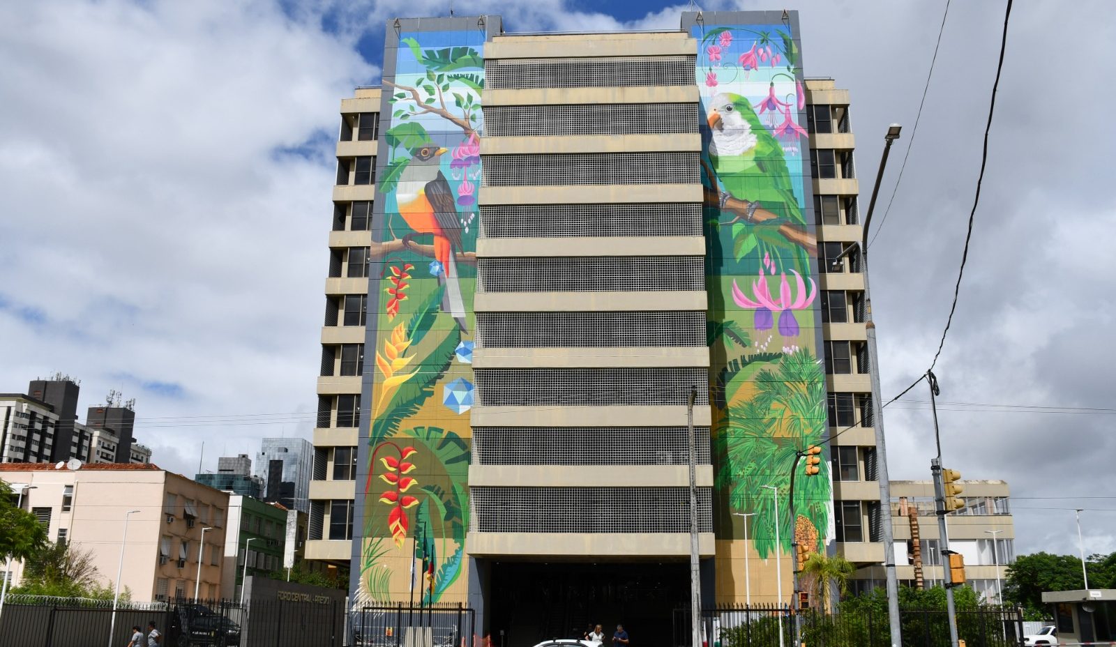 As laterais do Prédio I do Foro Central de Porto Alegre receberam a obra Fauna e Flora, assinada pelo artista Tio Trampo. Cada painel mede 44,5 metros de altura por 7,7 de largura e retrata espécies emblemáticas do ecossistema gaúcho, como o sabiá-laranjeira, o periquito-verde e o brinco-de-princesa, flor símbolo do Estado.