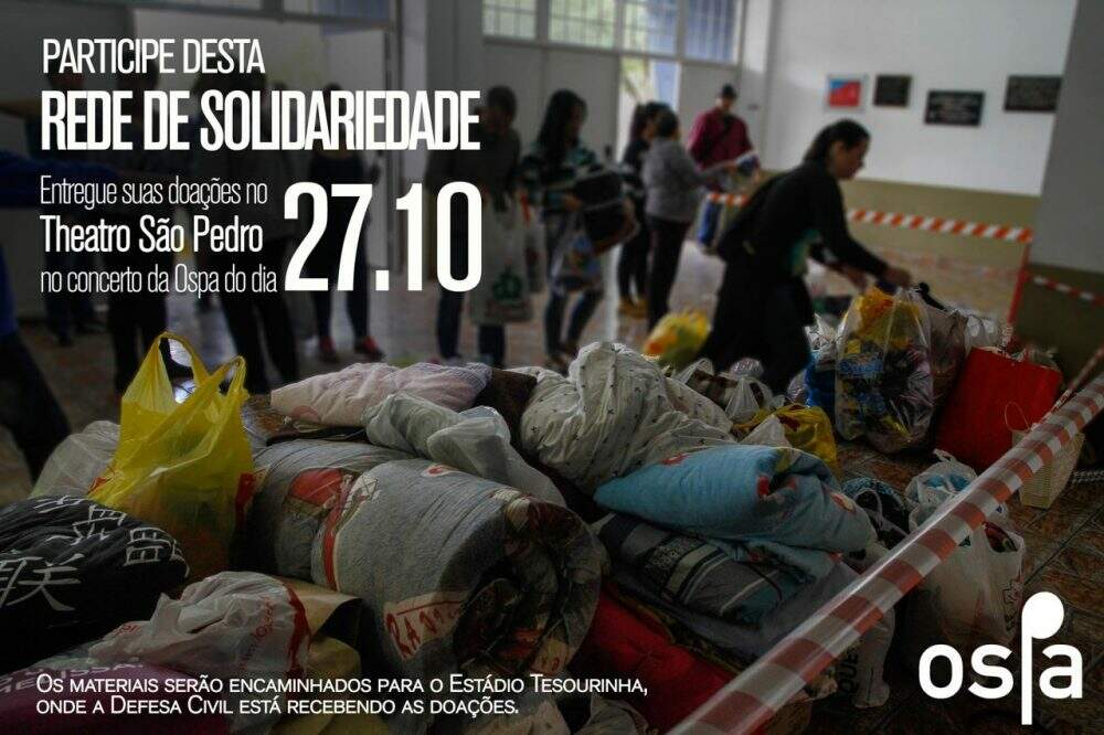 O último concerto da Ospa deste ano, que ocorre nesta terça-feira, no Theatro São Pedro, será especial. Antes da apresentação, às 20h30min, a orquestra receberá doações que serão levadas às vítimas das enchentes abrigadas no ginásio Tesourinha, em Porto Alegre. O show terá o maestro português Pedro Neves, regente da Orquestra Clássica de Espinho.