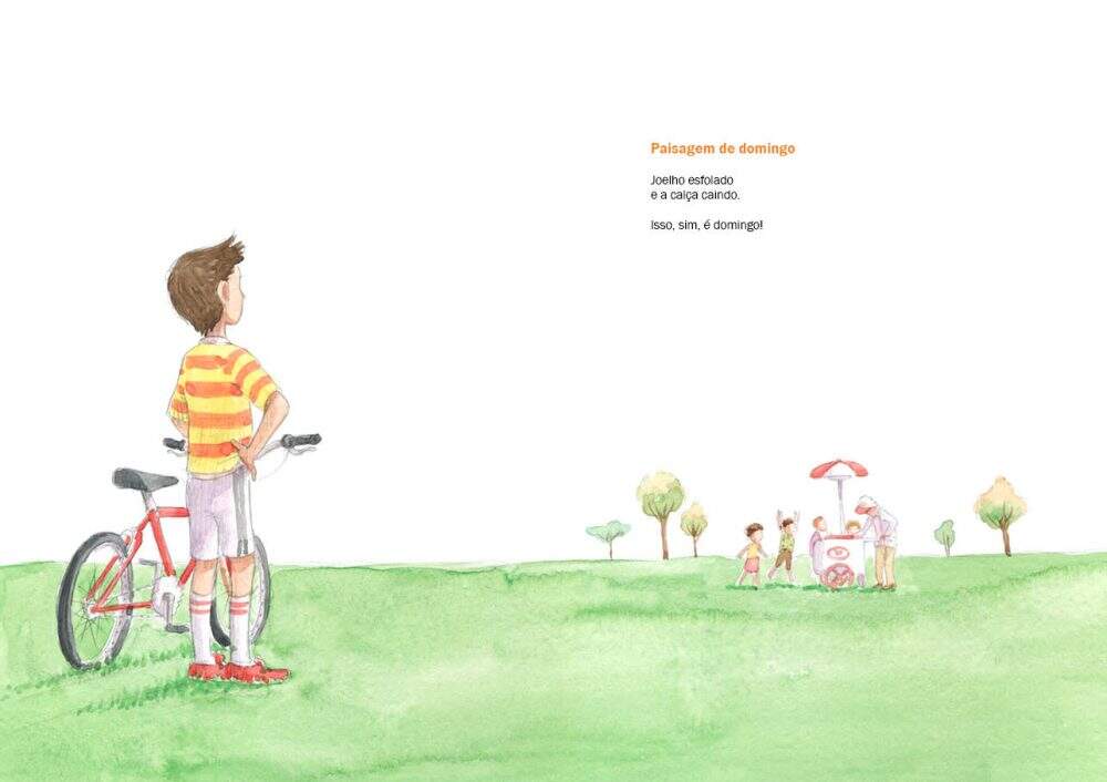 Em 44 páginas ilustradas e coloridas, Gutfreind explora toda a potência criativa e lúdica de temas como o céu, o sol, o domingo, os animais e o livre brincar. Os poemas tratam da efemeridade da infância, suas alegrias e dores, as brincadeiras e machucados, as cenas que ficam gravadas na memória para sempre.