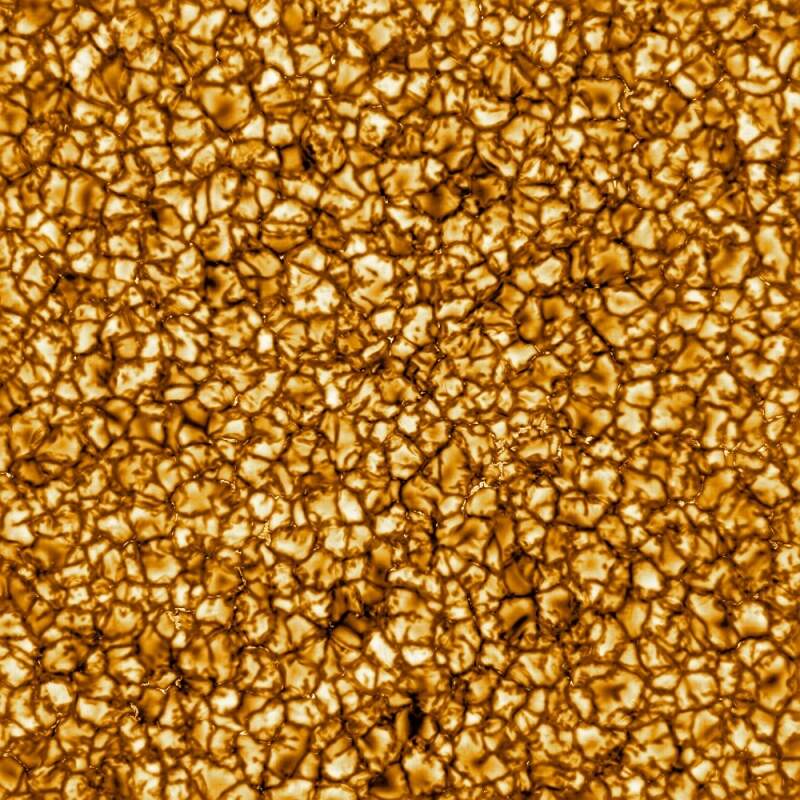 Capturado em detalhes impressionantes, a face do sol é dividida em “núcleos”: estruturas semelhantes a células, cada uma do tamanho do Texas, que transportam calor de dentro do Sol para fora. O gás quente sobe nos centros brilhantes das células, esfria e depois afunda de volta nas faixas escuras que separam as células.