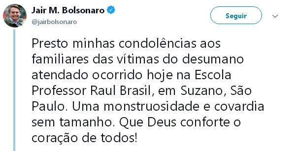 Um adolescente e um homem encapuzados atacaram a Escola Estadual Raul Brasil, em Suzano (SP), na manhã desta quarta-feira (13), e mataram sete pessoas, sendo cinco alunos e duas funcionárias do colégio. Em seguida, um dos assassinos atirou no comparsa e, então, se suicidou. Pouco antes do massacre, a dupla havia matado o proprietário de uma loja da região.