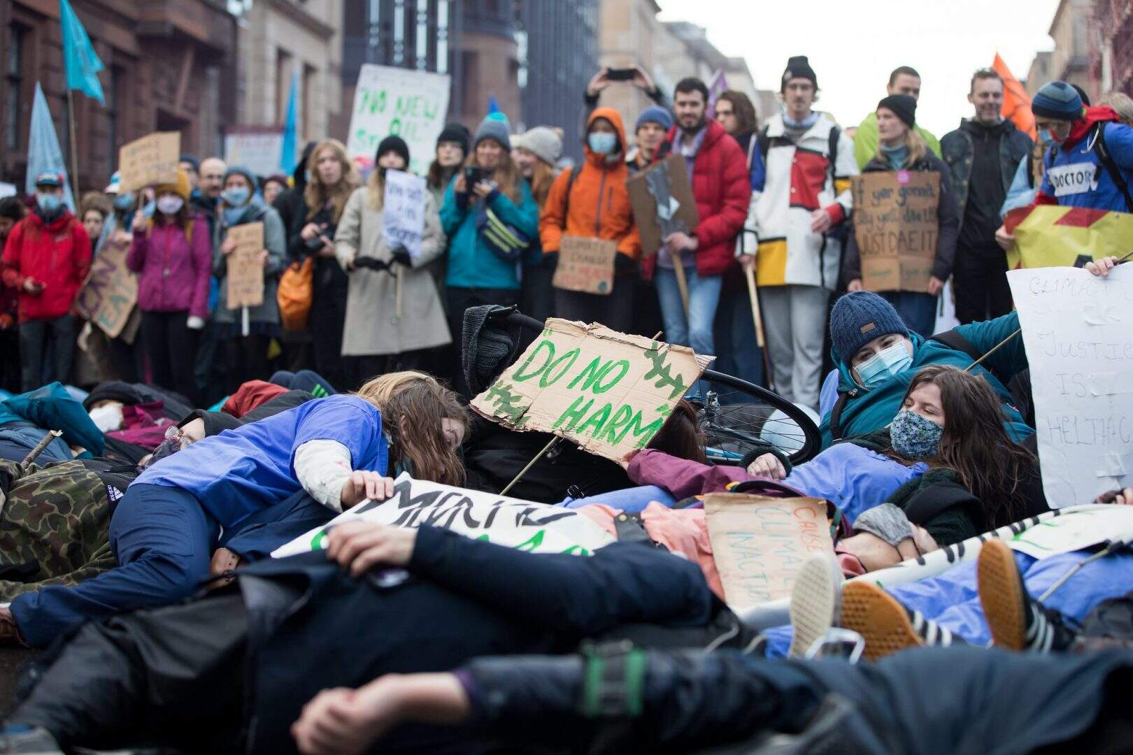 Ativistas protestam nas ruas de Glasgow durante a COP-26.