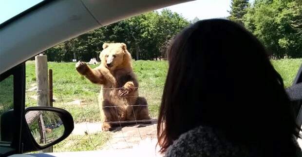 Samson Lee estava dirigindo pelo parque Olympic Game Farm com uma amiga. Ela acenou para o urso, que é treinado para acenar e respondeu ao cumprimento.