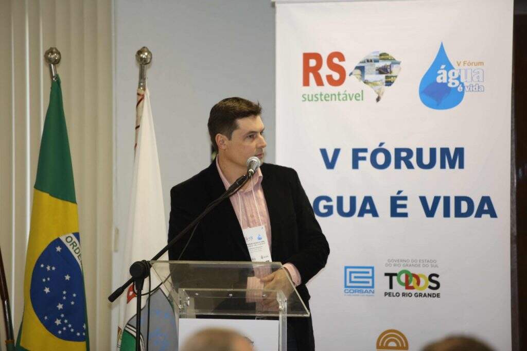 O presidente do Comitê de Gerenciamento da Bacia Hidrográfica dos rios Vacacai e Vacacai-Mirim, Alexandre Swarowsky foi um dos painelistas do V Fórum. Ele abriu sua explanação com um slide mostrando, em desenho, pessoas adorando um monumento erguido à água. Ele enfatizou que a água não vai faltar, porém 99% dela é salgada e apenas 0,01% no mundo é oriunda dos rios. “O problema é a disponibilidade e a qualidade”. Ele mencionou as regiões brasileiras, não uniformes em relação aos índices populacionais e consumo. Como gerenciar é a questão. Uma das orientações do palestrante diz respeito a um maior conhecimento sobre as bacias hidrográficas, uma questão de gestão. Os próprios Comitês podem contar com a participação dos usuários, para definir ações e ajudar a escolher “a água e a qualidade que se deseja ter”.