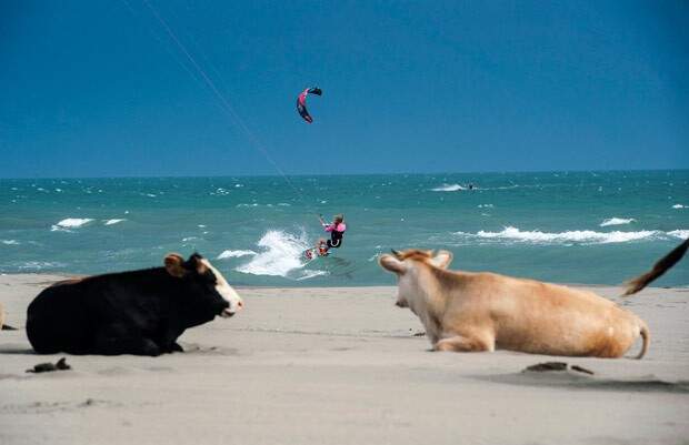 Vacas foram flagradas “curtindo” uma praia no mar Mediterrâneo, perto da cidade de Ulcinj, em Montenegro, enquanto atletas aproveitavam as boas ondas no local para praticar kitesurf.