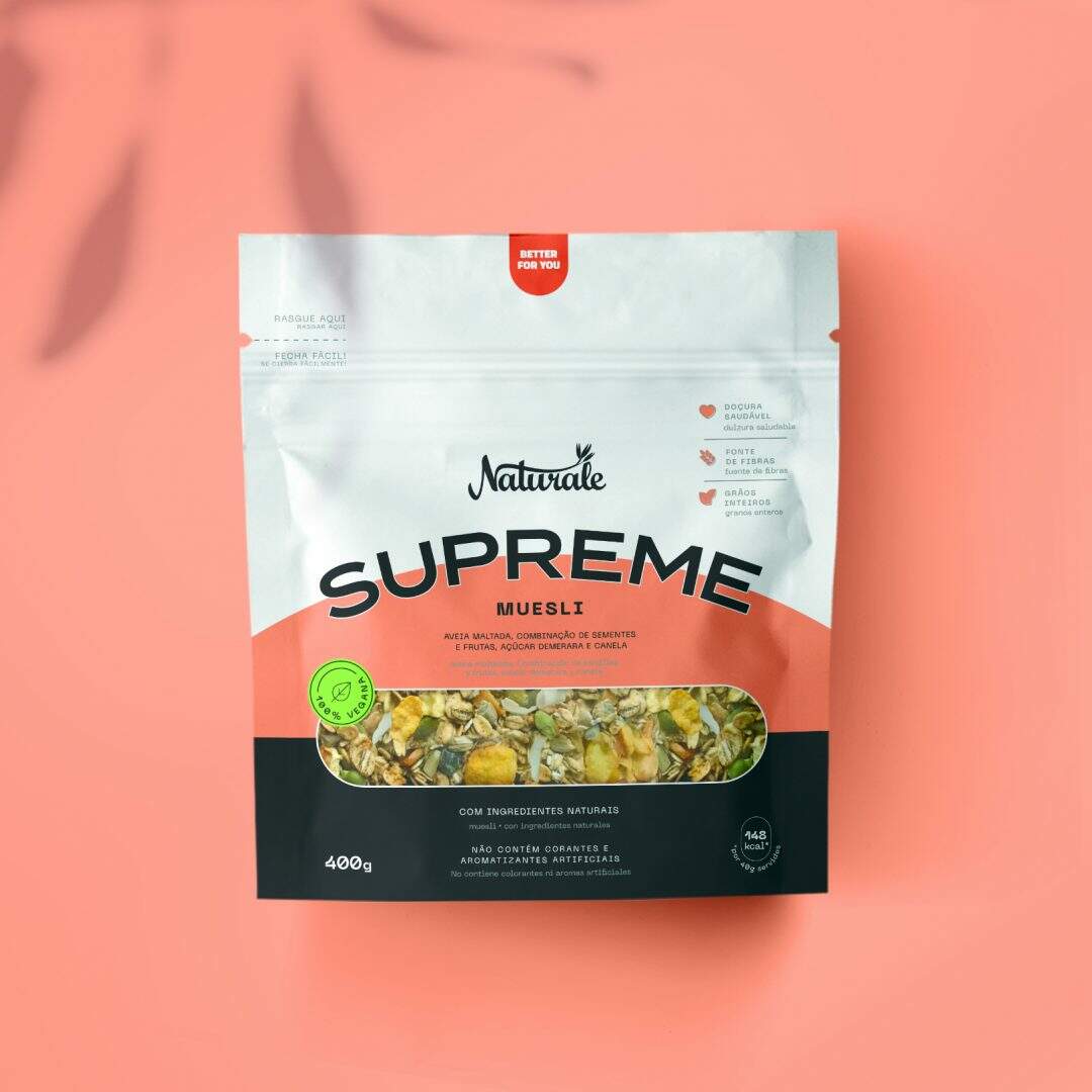 Durante 10 semanas, a equipe de criação trabalhou na concepção do projeto. Com o objetivo de fugir do design e das cores utilizadas tradicionalmente pelas marcas do mesmo segmento, a partir da definição da arquitetura da informação da embalagem, os profissionais optaram por dar destaque ao nome Supreme. “Decidimos não usar imagens do produto e nem sugestões de consumo. Foi uma estratégia de posicionamento para um produto novo, que vai competir com as granolas mais tradicionais do mercado brasileiro”, avalia o diretor de negócios Moisés Hansen.