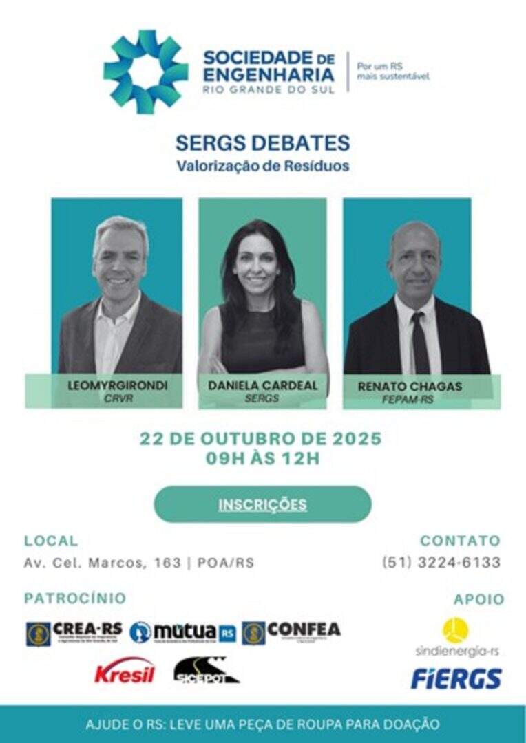 A Casa da Engenharia, por meio da SERGS (Sociedade de Engenharia do Rio Grande do Sul), promove o próximo SERGS Debates com foco em um tema que se torna cada vez mais central no cenário ambiental, econômico e social: a valorização de resíduos. O evento ocorre nesta quarta-feira (22), das 9h às 12h, na Av. Cel. Marcos, 163 – Pedra Redonda, em Porto Alegre.