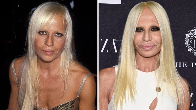 A estilista italiana da grife de moda Versace errou na mão ao aumentar o lábio superior com colágeno, remover as rugas com botox e modificar seu nariz. (foto: reprodução)