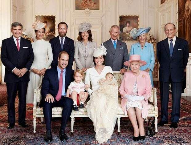Entre os convidados para o batizado, estavam os bisavós da princesa, a rainha Elizabeth II e seu marido, o príncipe Philip, seu avô paterno, o príncipe Charles, e seus avós maternos, Carole e Michael Middleton. A mulher de Charles, Camilla Parker-Bowles, também esteve presente e aparece na foto oficial, assim como os irmãos de Kate, Pippa e James Middleton, além dos padrinhos e seus esposos ou esposas.
