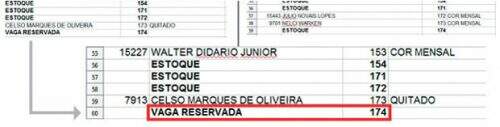 Duas planilhas apreendidas na sede da Bancoop indicam a situação em que estavam os cooperados responsáveis pelas unidades do empreendimento. Para cada apartamento, havia uma indicação sobre o titular ou a informação de que o apartamento estava “em estoque”. Apenas o 174 tinha o status de “vaga reservada”