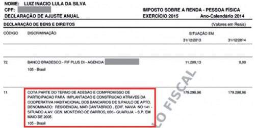 A partir de 2009, Lula e Marisa declararam no IR cota do apartamento 141. Na declaração de 2015 (referente a 2014), o casal fez isso novamente. Mas, em abril de 2014, a OAS vendeu a unidade a uma terceira pessoa. O MPF diz que o casal deu informações falsas à Receita e fez lavagem de dinheiro.