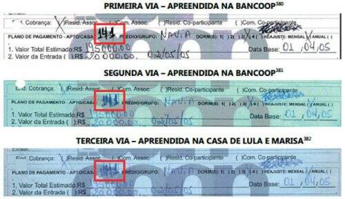 Em 2005, a mulher de Lula e ex-primeira-dama, Marisa Letícia (falecida em fevereiro do ano passado), assinou uma proposta de adesão para a aquisição de um apartamento no Guarujá. A imagem indica que sobre o número “174”, referente ao triplex, foi escrito “141”.