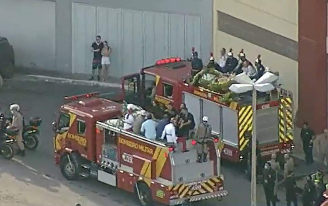 As duplas Maiara e Maraísa e Henrique e Juliano estão sobre o caminhão do Corpo de Bombeiros enquanto corpo de Marília Mendonça sai em cortejo por Goiânia.