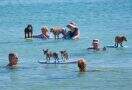 Banhistas passeiam com seus cachorros em pranchas sobre o mar