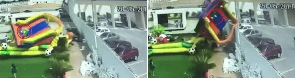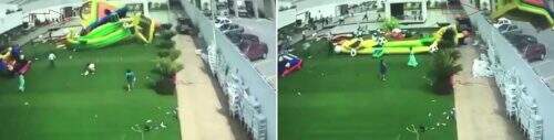 Uma câmera de segurança flagrou o momento em que uma ventania fez brinquedos infláveis decolarem com crianças em um parque infantil de San Luís Postosí (México), no último domingo (28).