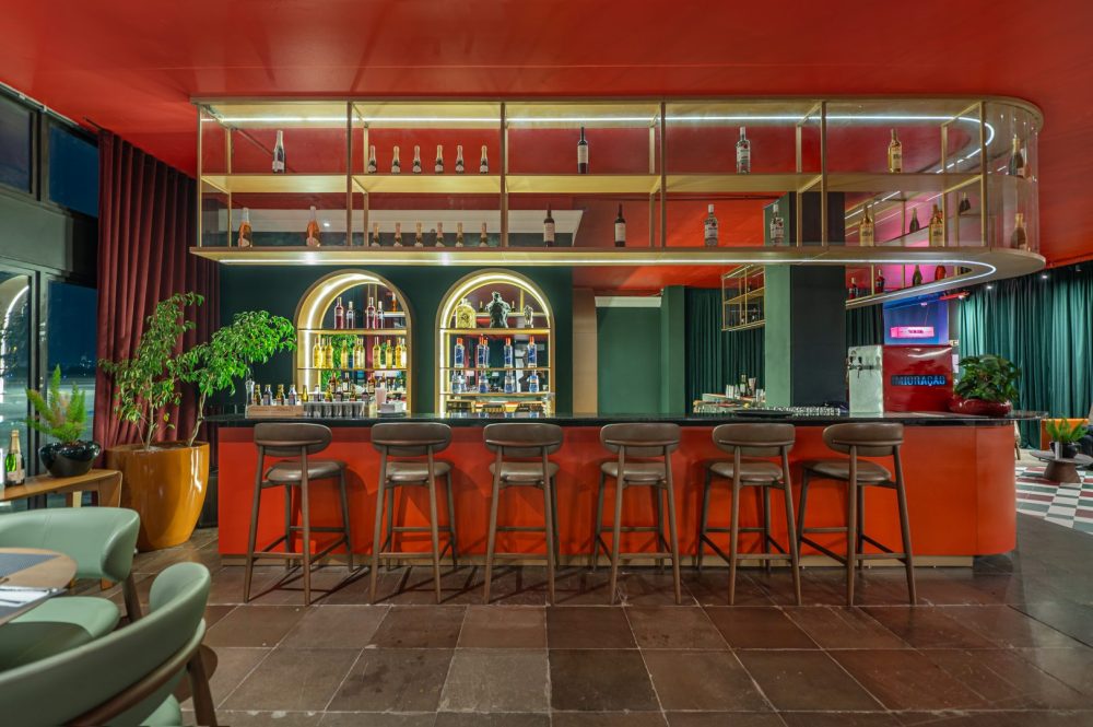 A ambientação remete às trattorias e clubes privados do século XX, com madeira escura, formas curvas, cortinas de veludo vermelho e luz cênica. Lounge, bar e área de jantar se conectam de forma fluida, permitindo diferentes usos ao longo do dia. Cada escolha material reforça o conceito da obra: uma marcenaria personalizada com volumetrias generosas, tecidos naturais e uma paleta de tons terrosos evocam um lugar onde arquitetura, arte e narrativa caminham juntas.