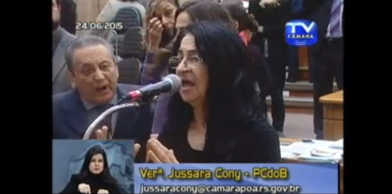 Imagens captadas pela TV Câmara mostram a agressão sofrida pela vereadora Jussara Cony (PCdoB), que foi empurrada pelo vereador Nereu D’Ávila (PDT), na Câmara Municipal de Porto Alegre. Ela irá interpelar a Comissão de Ética da Casa sobre a postura desrespeitosa e violenta do vereador. Para Jussara, não tomar as medidas cabíveis seria conivência com esse tipo de agressão às mulheres que ocupam espaços políticos.