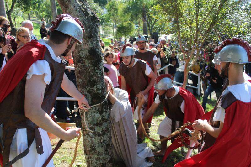 Foto: Gabriel Perotti/DivulgaçãoApós dois anos, um dos principais momentos desta Sexta-Feira Santa (15) voltou a ocorrer de forma presencial em Caxias do Sul, na Serra, na 18ª edição da Via-Sacra da Juventude, realizada pelo Setor Juventude da Diocese de Caxias. Cerca de 350 pessoas acompanharam a encenação que ocupou as escadarias junto ao Monumento Jesus Terceiro Milênio, nos pavilhões da Festa da Uva.