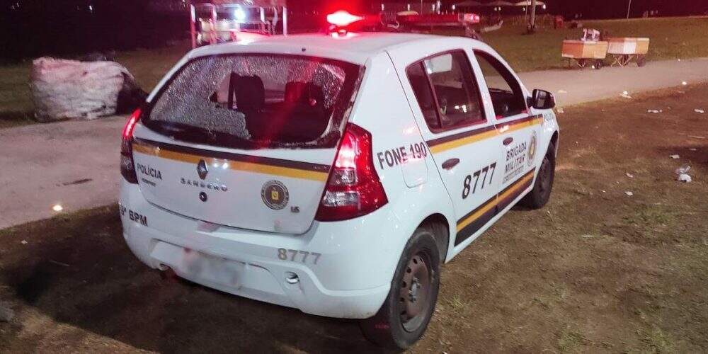 Uma viatura da BM (Brigada Militar) foi depredada no final da noite deste domingo (26) durante operação para dispersar aglomerações na Orla Moacyr Scliar, em Porto Alegre. O veículo da BM, um Renault Sandero, prefixo 8777, do 9º BPM, teve até o vidro traseiro quebrado.