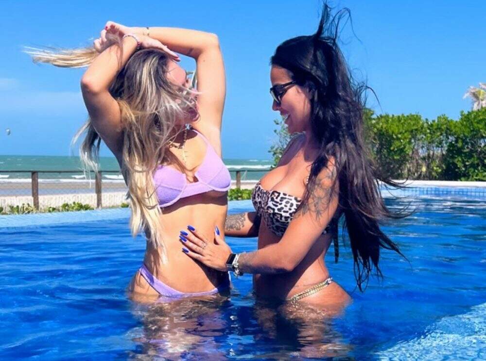 Virginia Fonseca mostrou o abdômen saradíssimo de biquíni em dia de piscina com amiga, a também influencer Pamela, na tarde deste domingo (05), com direito até a um confere da moça.