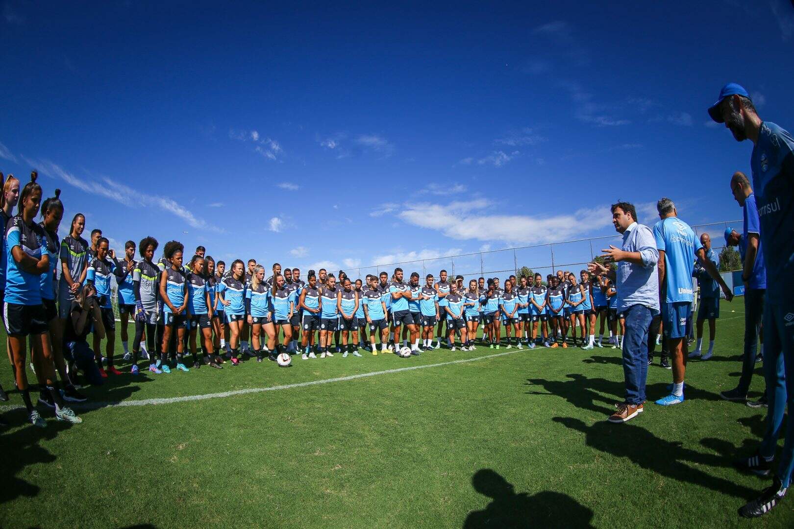 Antes do começo das atividades, o presidente do Grêmio, Alberto Guerra, e os técnicos Felipe Endres, do futebol feminino, e Renato Portaluppi se reuniram no centro de um dos campos para a ação.