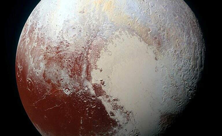 Plutão, que é menor que a lua da Terra e tem um diâmetro de cerca de 2.380 km, orbita aproximadamente a 5,8 bilhões de km do Sol, cerca de 40 vezes mais longe que a órbita da Terra. Sua superfície apresenta planícies, montanhas, crateras e vales.