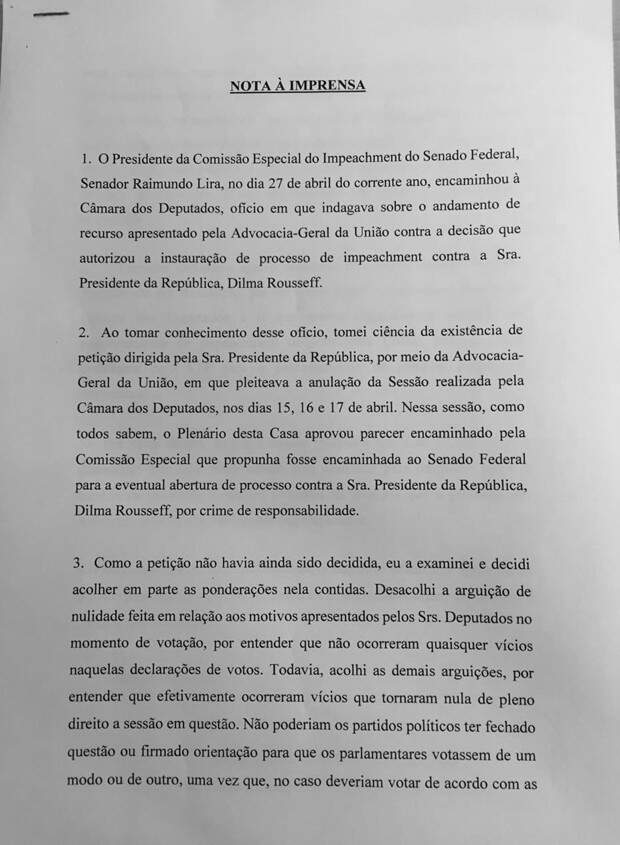 “Por essas razões anulei a sessão realizada nos dias 15, 16 e 17 e determinei que uma nova sessão seja realizada para deliberar sobre a matéria no prazo de 5 sessões contados da data em que o processo for devolvido pelo Senado à Câmara dos Deputados”, disse.