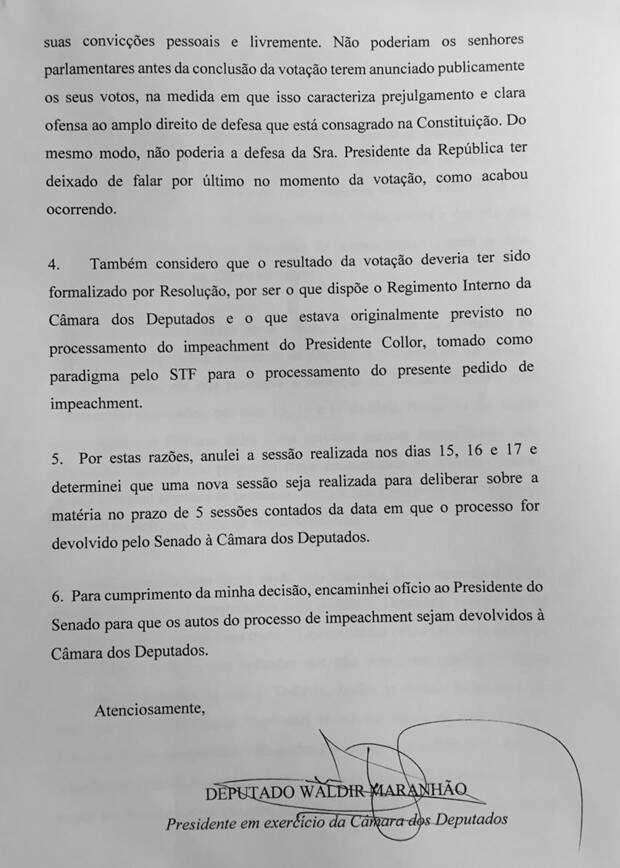 Ato do presidente em exercício da Câmara que anula a votação do processo de impeachment na Câmara (Foto: Reprodução)