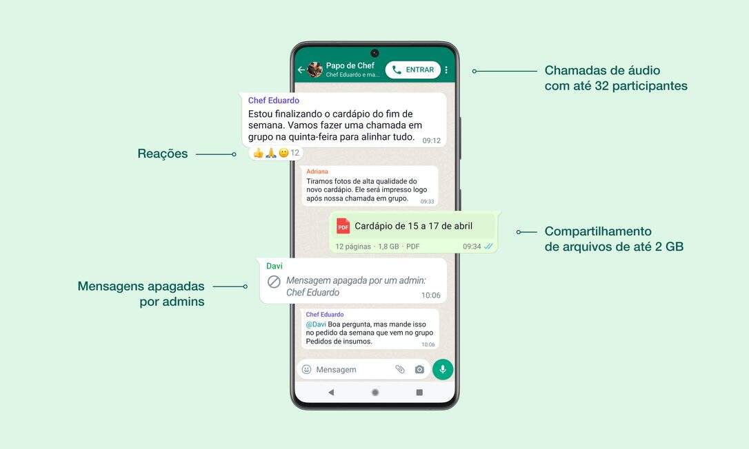 O recurso de apagar mensagens, que até então é restrito ao emissor, se estenderá a administradores de grupos, ou seja, eles poderão atuar como moderadores de conteúdo e deletar mensagens que considerarem problemáticas. Já as ligações em grupo, restritas a oito pessoas simultaneamente, poderão ser feitas com até 32 participantes.