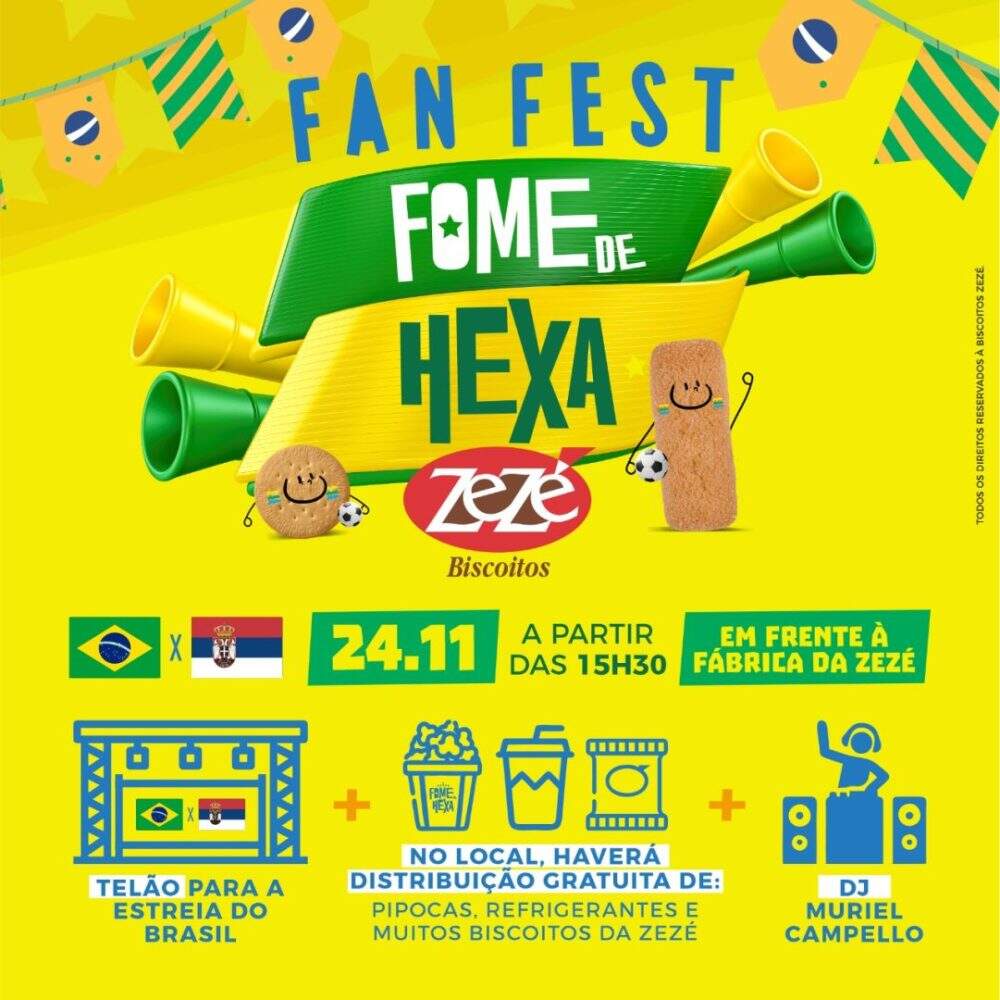 A Copa do Mundo do Catar já começou e nada melhor do que acompanhar a estréia do Brasil na “Fan Fest Fome de Hexa”, promovido pela Zezé Biscoitos. O Brasil estréia no mundial na quinta-feira (24), e a programação começa a partir das 15h30min.