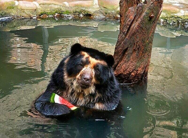 Nesta semana, enquanto Mimosa, a onça-pintada, brincava de bola na piscina; Kiara, a tamanduá-bandeira, tomava um refrescante banho de mangueira. Um alívio para os dias de calor. Cocha, o urso-de-óculos, que também tem uma piscina no recinto, não pensou duas vezes ao avistar um pedaço de melancia boiando na água: deu logo um mergulho para abocanhar a fruta.